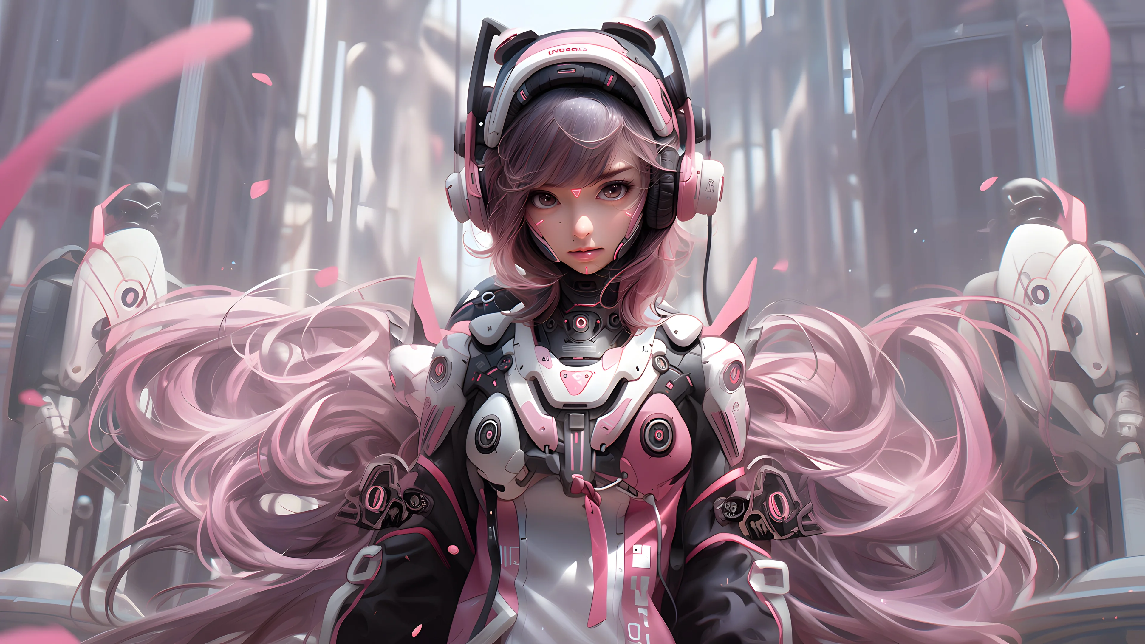 画面中,粉发少女身着粉白相间的未来机甲,头戴科技感耳机,立于未来都市的废墟之上,身后的护卫机甲与飘落的花瓣,将科幻的冷峻与柔美的浪漫完美平衡。细腻的光影、精致的机甲细节,高分辨率画质细节拉满,无论是赛博朋克爱好者、机甲迷,还是二次元玩家,这张壁纸都能为电脑桌面注入满满的未来科技感,是科幻主题桌面的绝佳选择。